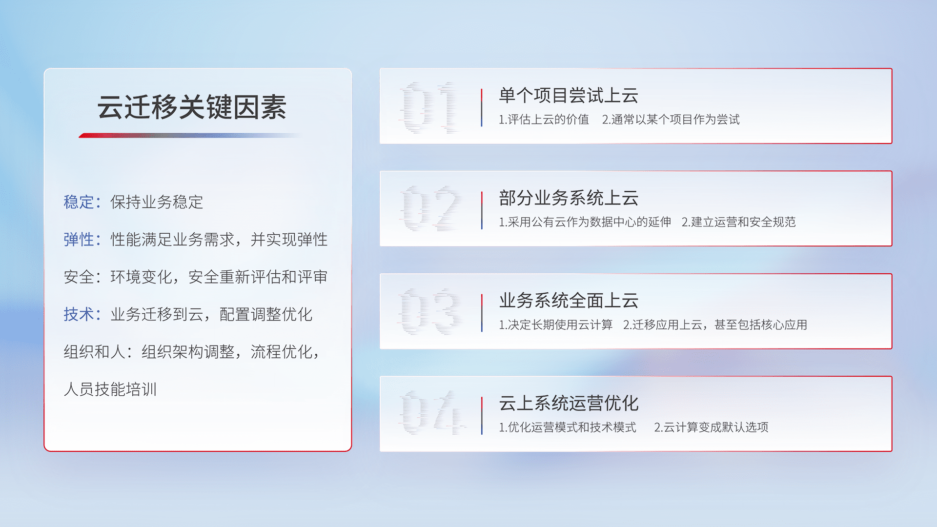 结合实际业务,,,从规划设计、、云平台选型、、、、云原生改造、、数据迁移、、集成交付,,,,迁移全过程为客户识别最佳上云路径,,做好风险识别管理,,设计网络架构、、、、身份权限、、安全审计合规、、、操作审计、、、日志审计、、、监控告警策略、、多站点容灾设计等,,对云上基础设施进行整体规划,,提升IT治理水平,,,,以满足弹性、、、高可用、、高性能的需求。。。。