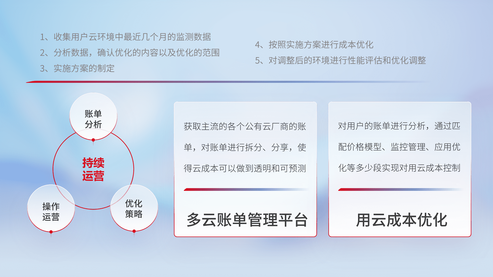 通过多云纳管,,以统一的资源数据模型把客户的云资源进行抽象和封装,,进而实现对多云资源的统一操作,,保障云资源管理的可靠性、、、稳定性与可用性。。量身定制化运维内容,,,配置、、、、开发运维、、、补丁管理、、备份、、、监控、、认证和访问管理、、、审计和日常巡检等,,,,保障在用云过程中的可靠度,,稳定度以及高可用率。。。。